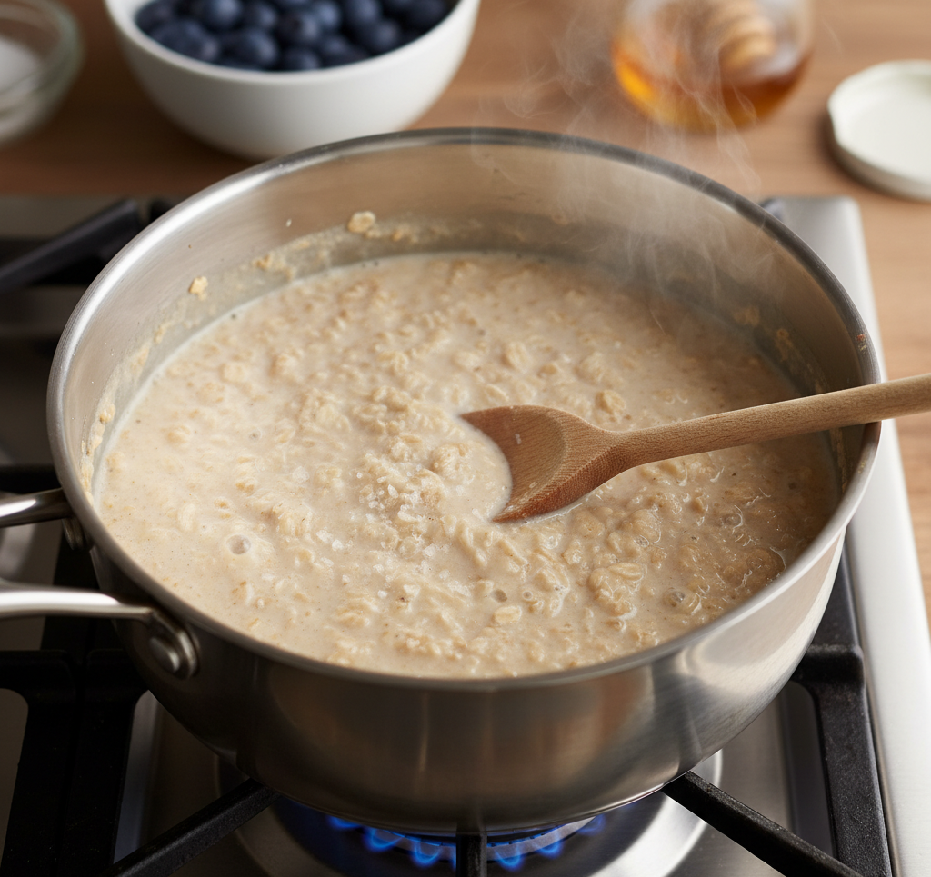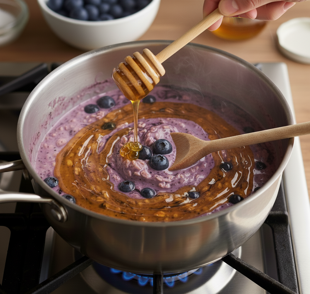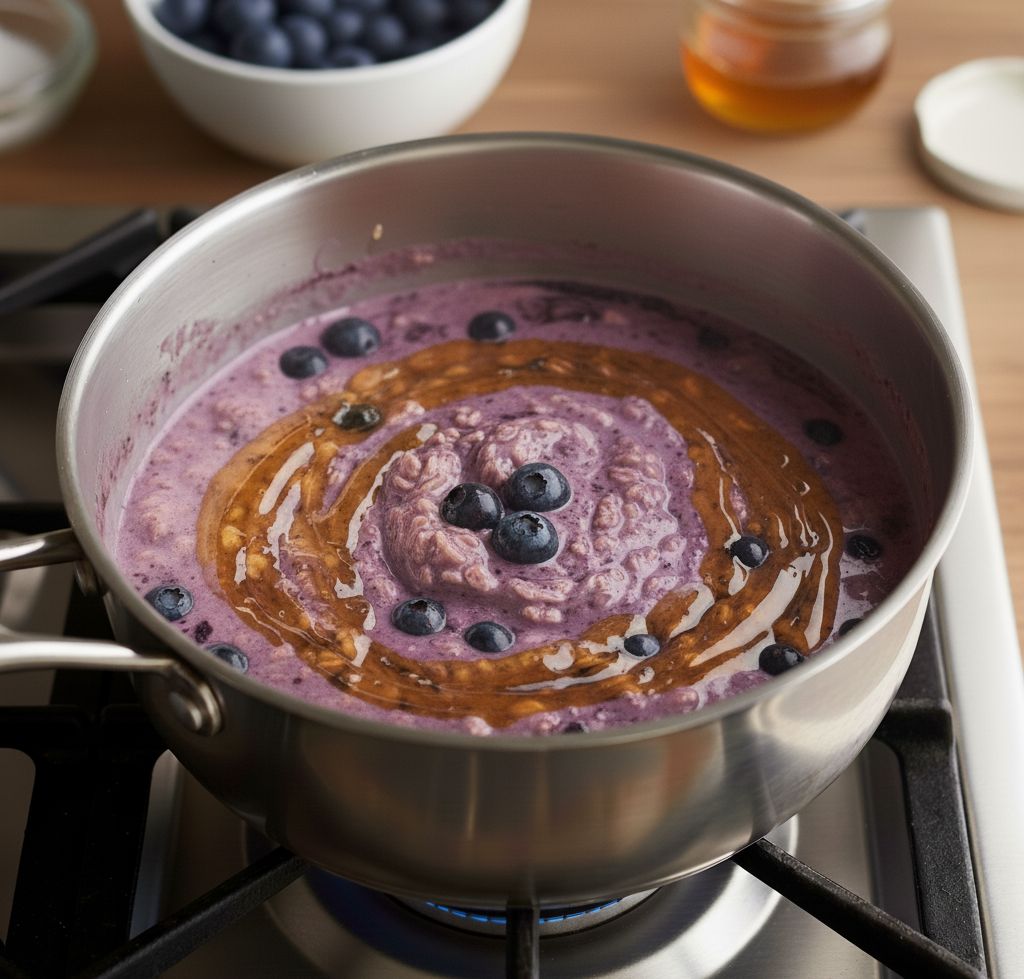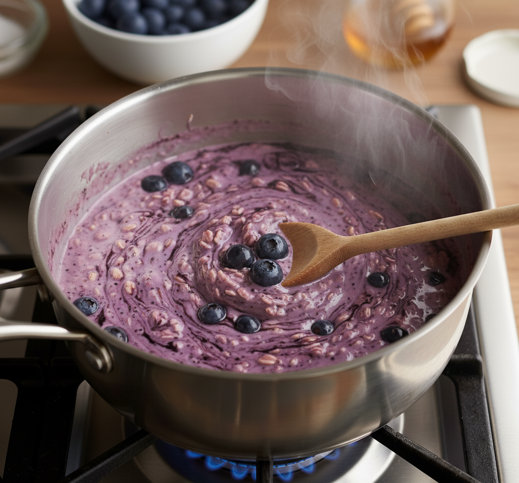 Add half of the blueberries to the pot while cooking. They will soften and release a natural sweetness, giving the oatmeal a beautiful purple glow.