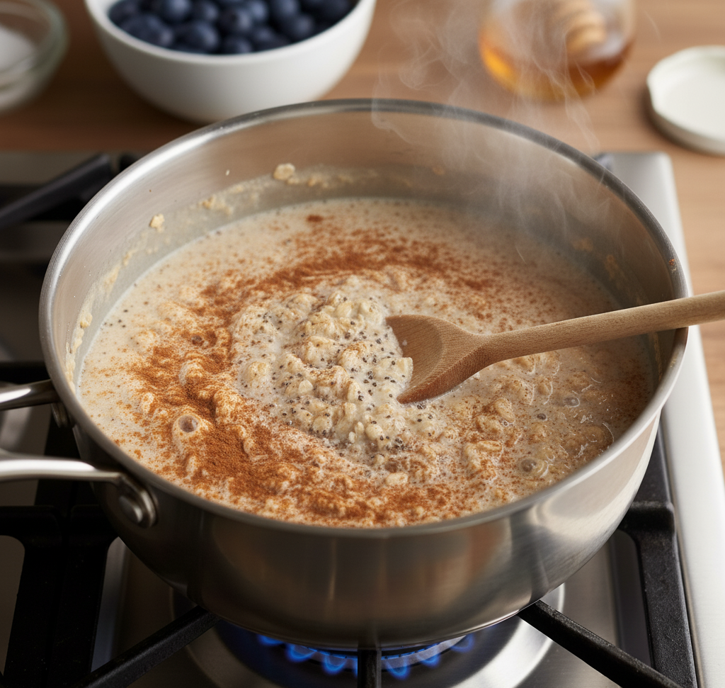 Stir in the cinnamon powder and chia seeds (or flaxseeds). Let it cook for another minute so the oats absorb the flavors.