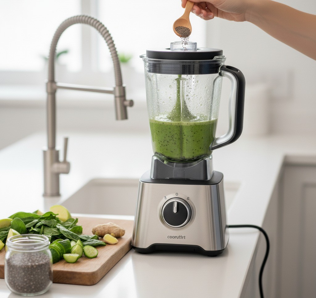 Toss in chia seeds and blend for another 10 to 15 seconds.
