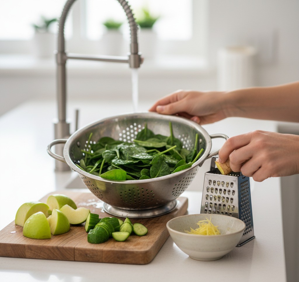 Wash spinach and chop the apple and cucumber into small chunks. Grate the ginger.